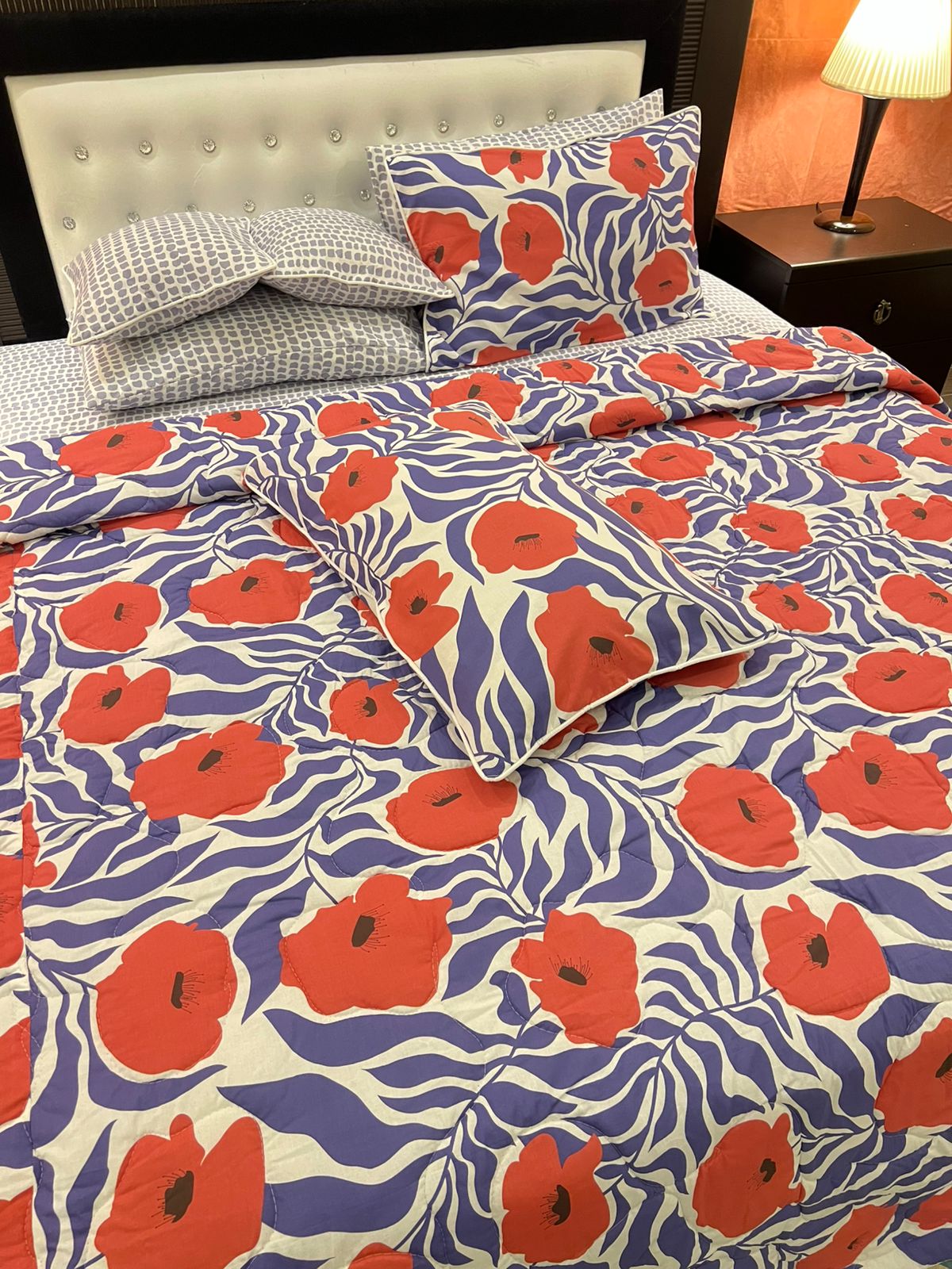 8 Pieces Queen Size Comforter Set: 1 sheet (90"x95"), 4 pillow covers (19"x29"), 2 cushion covers (16"x16") and 1 comforter with light polyester filling (90"x95")