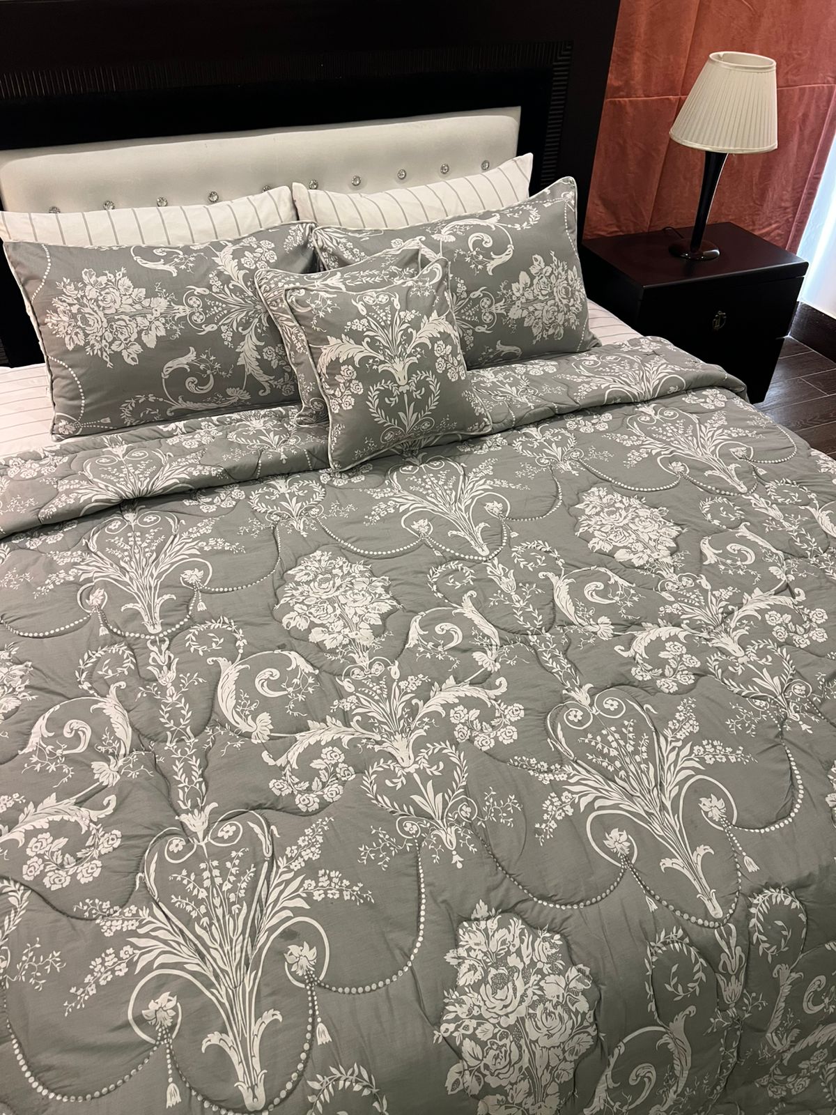 8 Pieces King Size Comforter Set: 1 sheet (95"x105"), 4 pillow covers (19"x29"), 2 cushion covers (16"x16") and 1 comforter with light polyester filling (90"x102")
