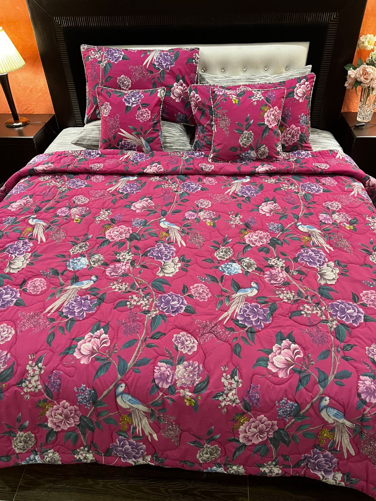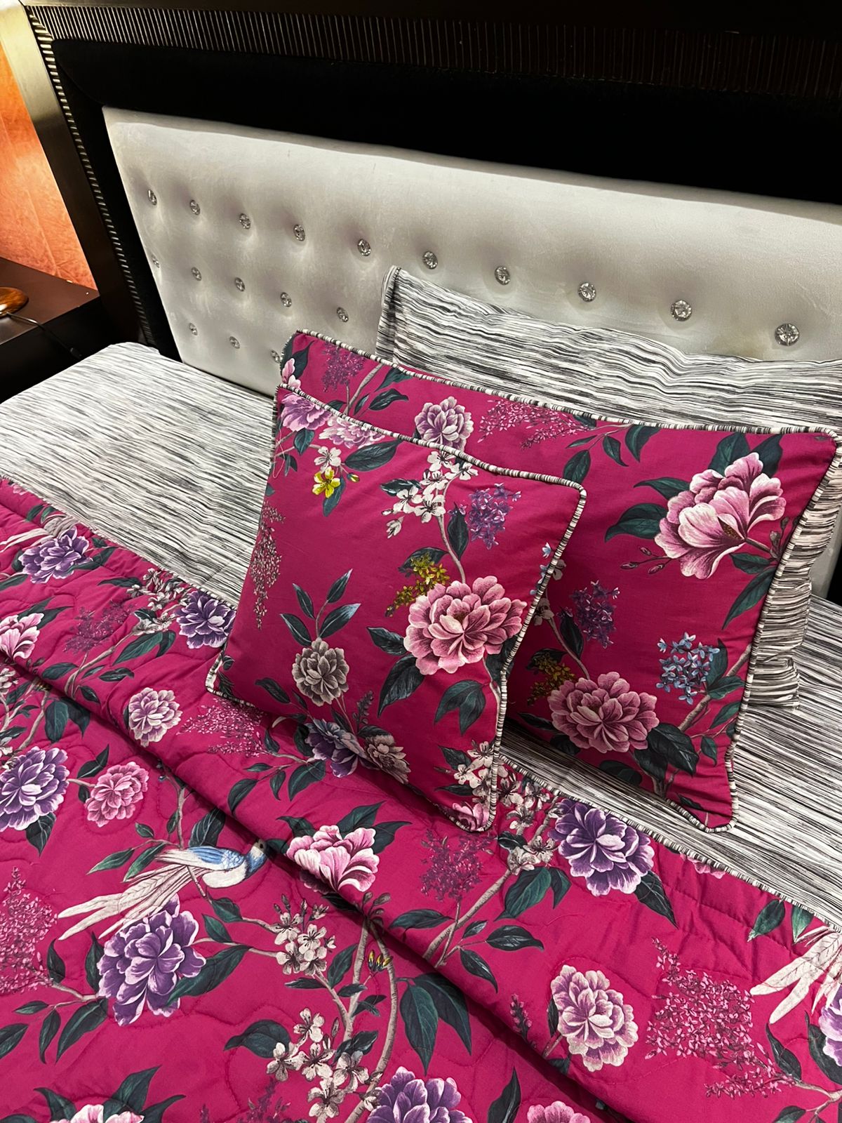 8 Pieces Queen Size Comforter Set: 1 sheet (90"x95"), 4 pillow covers (19"x29"), 2 cushion covers (16"x16") and 1 comforter with light polyester filling (90"x95")
