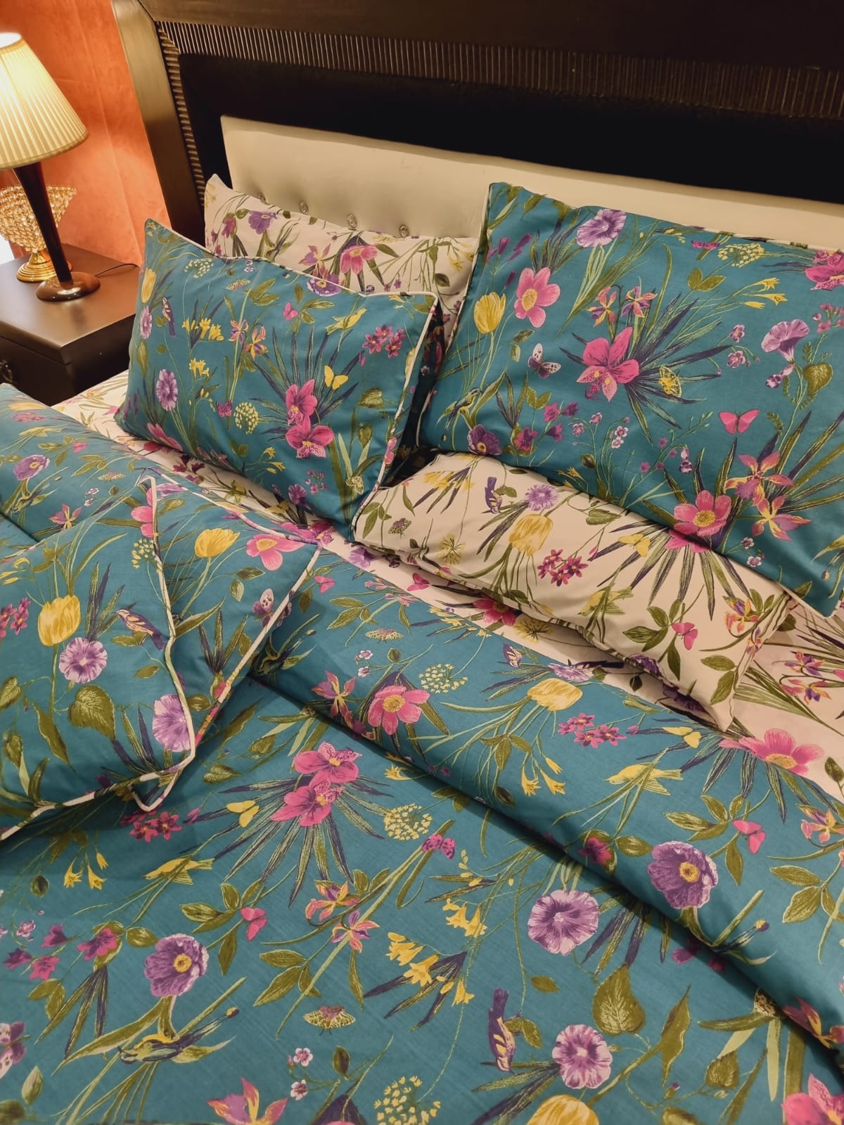 8 Pieces King Size Comforter Set: 1 sheet (95"x105"), 4 pillow covers (19"x29"), 2 cushion covers (16"x16") and 1 comforter with 300 GRM Winter polyester filling (90"x102")