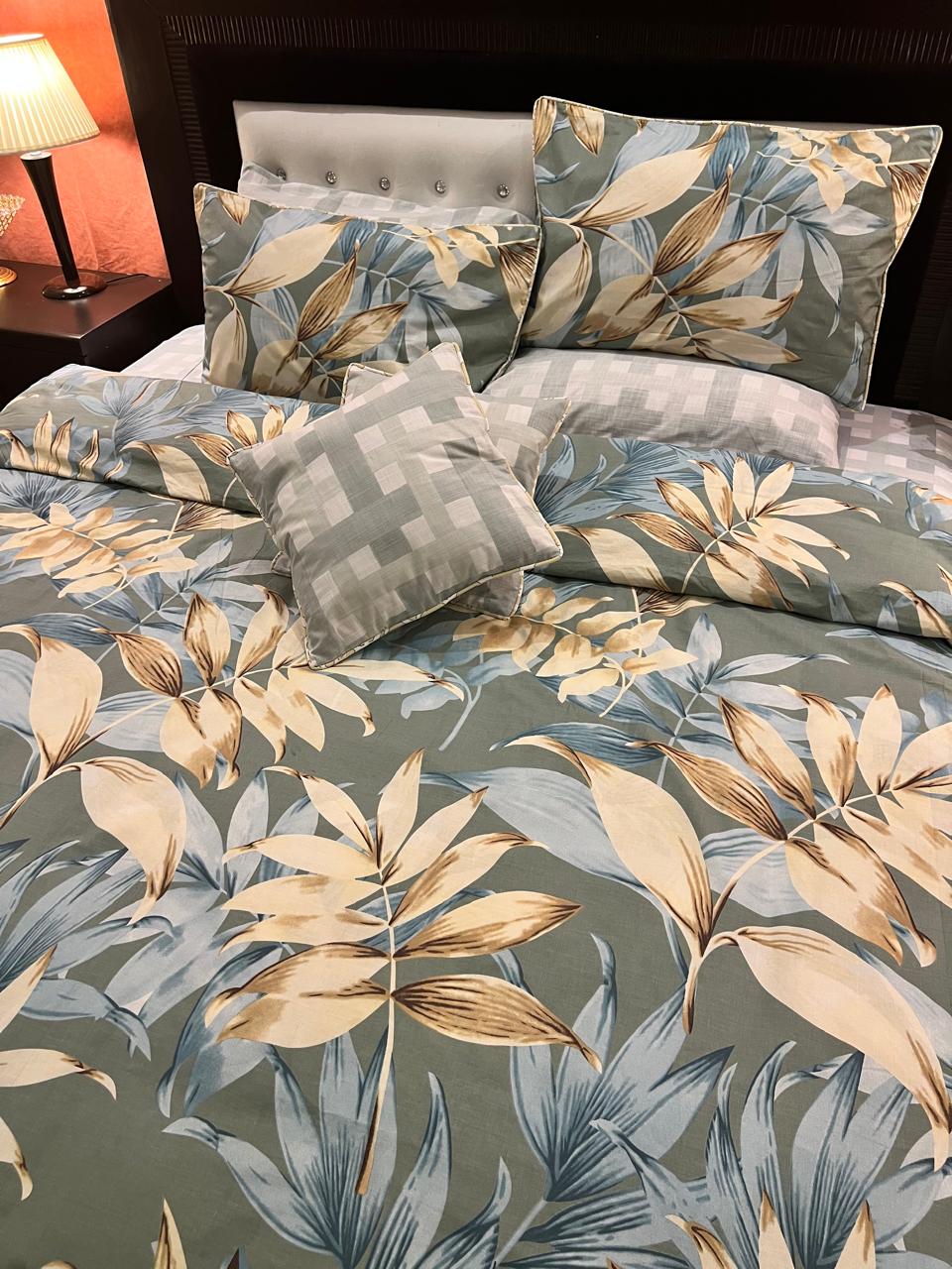 8 Pieces Queen Size Comforter Set: 1 sheet (90"x95"), 4 pillow covers (19"x29"), 2 cushion covers (16"x16") and 1 comforter with light polyester filling (90"x95")