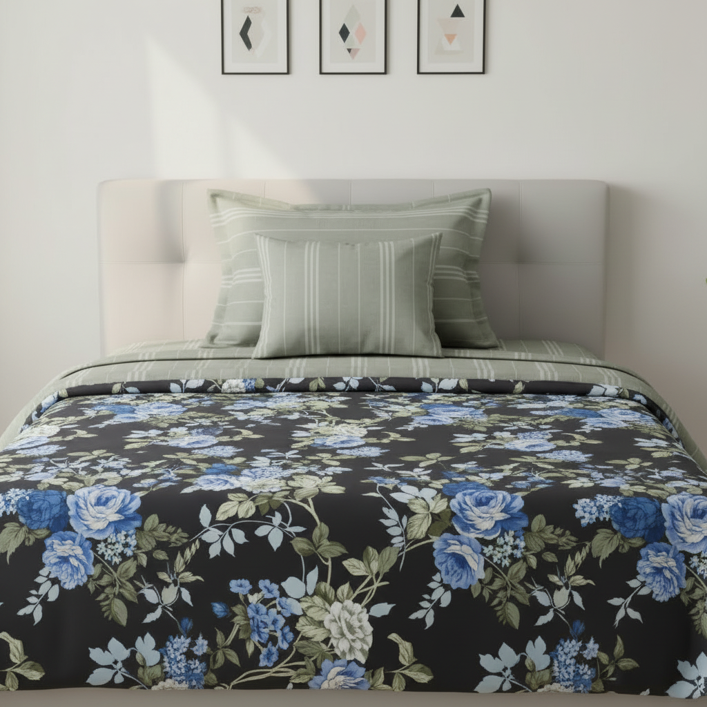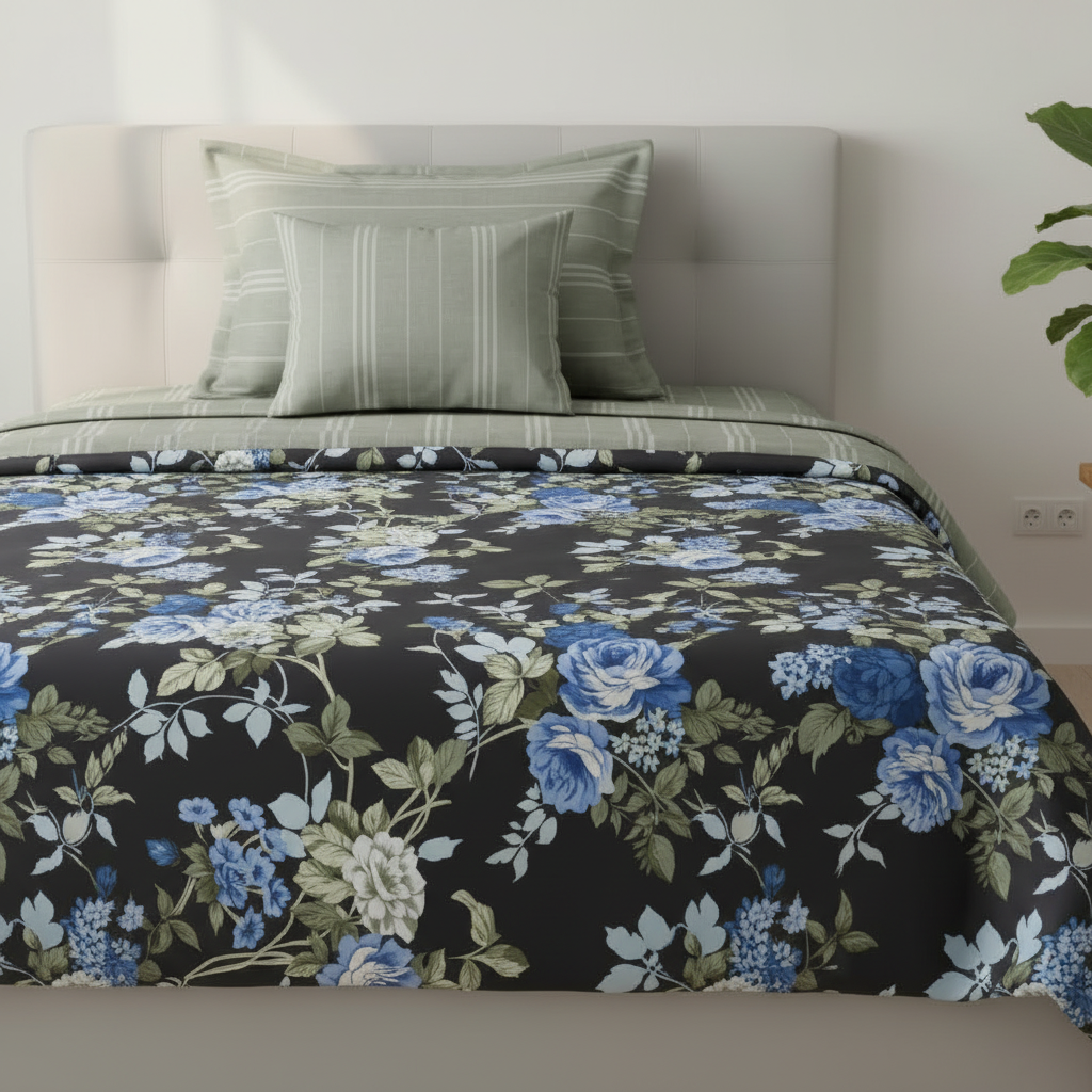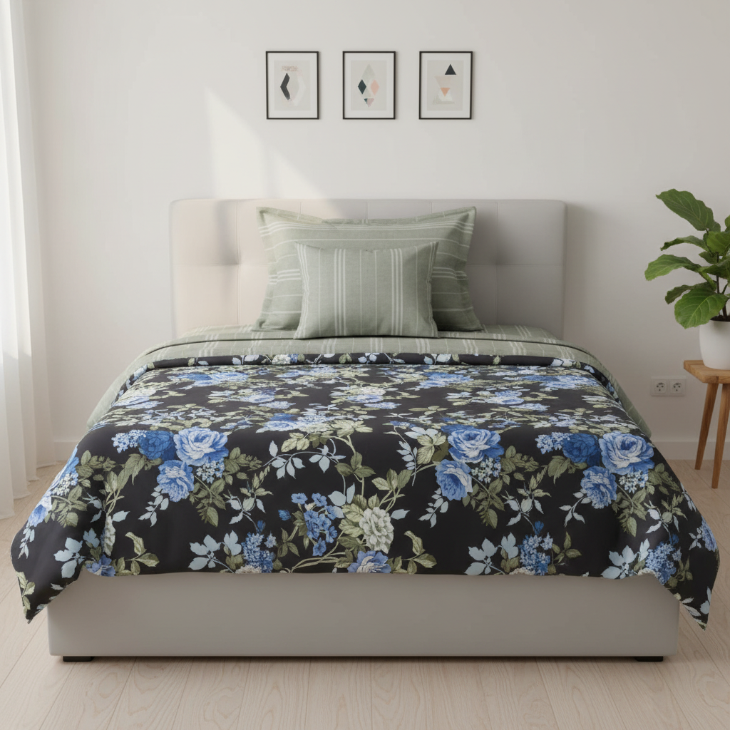 5 Pieces Single Size Comforter Set Includes 1 sheet (60"x90"), 2 pillow covers (19"x29"), 1 cushion cover (16"x16"), 1 comforter with light polyester filling (60"x90")